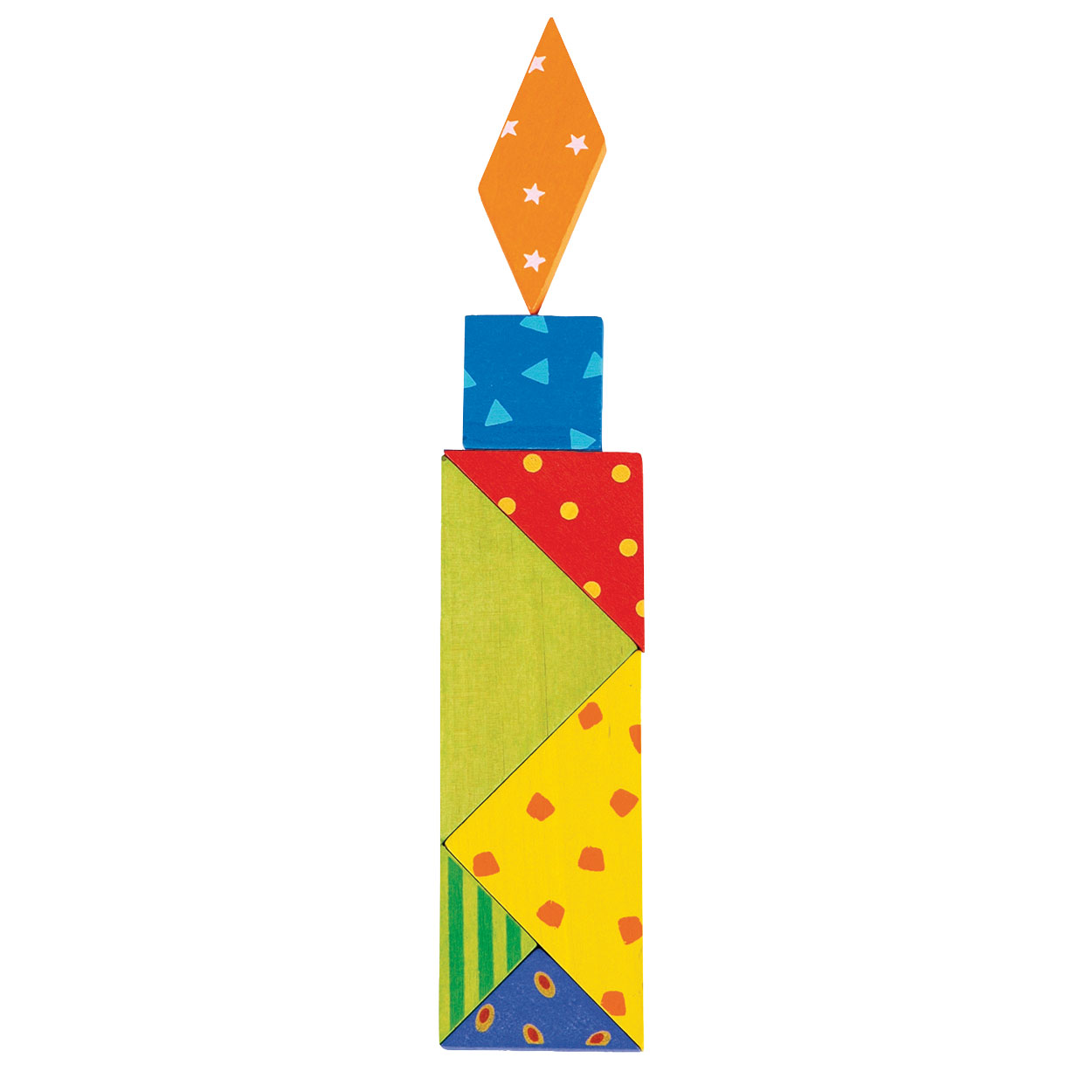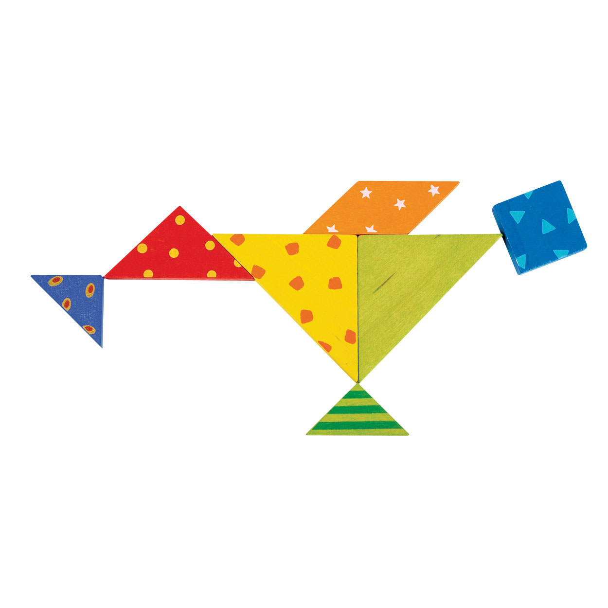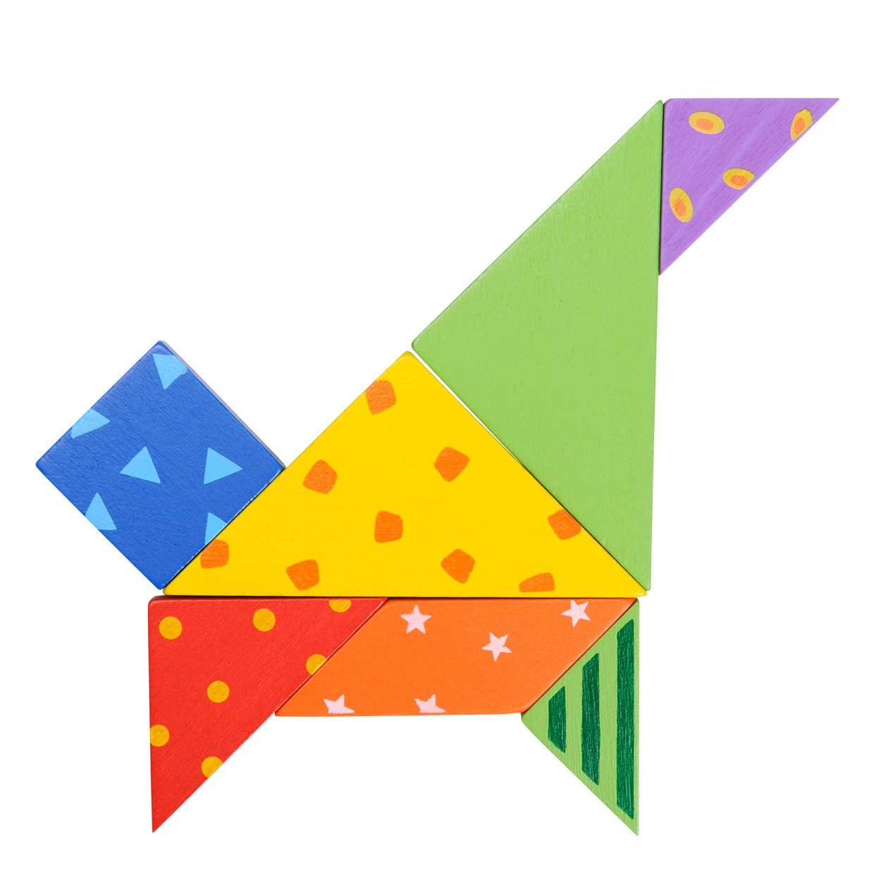 Houten tangrampuzzel voorzien van felle kleuren en vrolijke motiefjes. Leer spelenderwijs vormen en kleuren ontdekken.